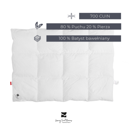 - Sprężystość puchu: 700 cuin — wysoka jakość puchu, który zachowuje swoją puszystość i miękkość przez lata.